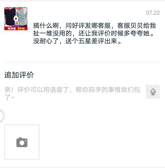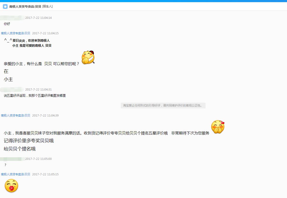 我不知道是有些店铺是设置了客服的奖励制度还是什么,前段时间小编看到有人在南*人买了两件衣服,本来很满意想给五星好评的,突然想起拆封的时候好像有一张好评返现卡片,就想问问客服好评截图发在哪里,可是接下来的聊天就精彩了。